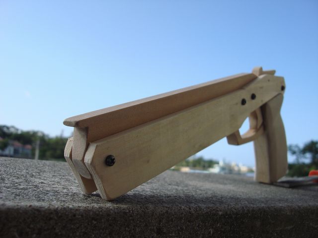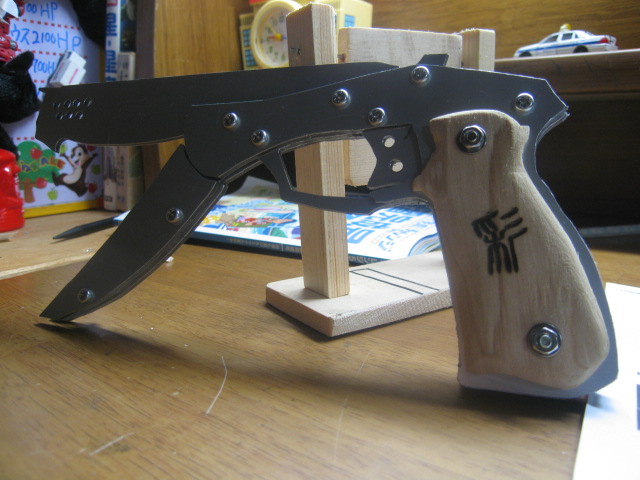 中央5mm厚、両側6mm厚の30mm幅の黒檀を使用。グリップはアガチス。高級感漂う木製のディンゴ。「切り出しは糸鋸とピラニアソーで頑張りましたが、堅くて大まかに切るのがやっとだったので、彫刻刀とプラモデル用のヤスリで地道に仕上げました。(トリガーガードの工作は本当に大変でした~。)」製作期間は1週間。作る楽しさや撃つ楽しさにご満足して頂けました^^