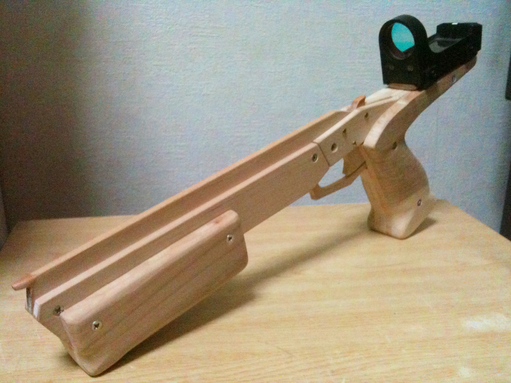 「使い慣れた素材で図面に忠実に作ることをテーマに作成。一切の接着剤を使わずネジで組立て。100番紙ヤスリのみで仕上げるという超スピード(手抜き)工法により約半日で完成!肉抜き穴は強度的に無理なようですのでマーカーで書きましたwww」 そうか、穴は書けば割れずにすんだのかw ゴム銃射撃名手の作ったディンゴにはオプションでダットサイトも搭載可能!