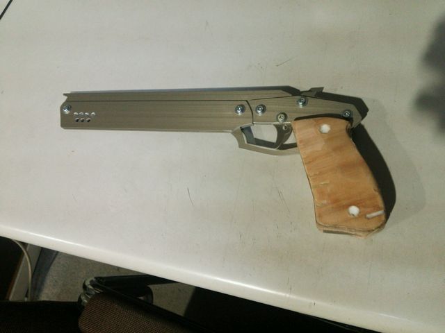 高校の課題研究でオリジナルゴム銃を作る前に試しに作ったというストライクディンゴ。銃身は27cm。アルミフラットバーをコンターマシンで切断して、ボール盤で穴開け。ビスやグリップは手を抜きだそうですw 学校の設備を使えばメタル輪ゴム銃も作りやすいことでしょう。次が本番のオリジナルゴム銃ということで、どんなものが出来上がるのか楽しみです!
