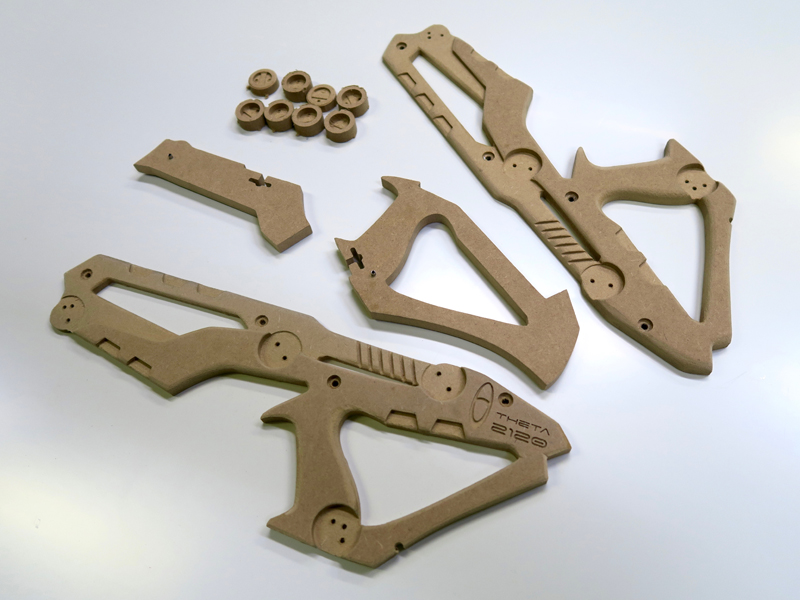 CAMソフトでNCプログラムを作成してしまえば、あとはCNCフライスが勝手にやってくれます。手作りでは躊躇してしまう形状も、思う存分デザインに盛り込めます。ロゴを掘るのだってお手の物。MDFは気持ちいいくらいサクサク削れて扱いやすいです。