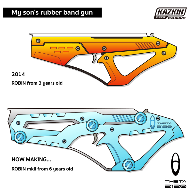 初代とMk-IIを比較するとサイズアップしているのがよく分かります。わずか3年で使えなくなるほど、子供は成長してしまうもの。でもこのMk-IIも大人が持つとまだ窮屈です。なので何年かしたら今度はMk-IIIを作る日が来る事でしょう、その時まだ息子がゴム銃をやっていればの話ですが。