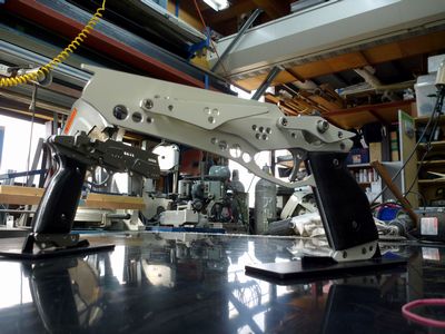 装弾時、コヨーテは銃の上端のラインが一直線上にあるのに対し、リカオンは回転翼の頂点が若干、突出しています。これにより射撃時に狙い易いのは前者となります。またコヨーテの方が重いのは、使用しているアルミ材のパーツ数が多いからです。ちなみに製作に掛かる手間暇は、どちらも大差ございません。。