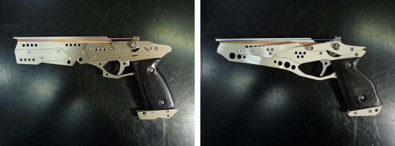 なので1発装填する度に、回転翼をコヨーテだと180°巻くのに対し、リカオンは90°です。連発銃の最大装弾数は“どれだけゴムを巻けるか”で決めています。よって1発でゴムを巻く(引き伸ばす)量の小さいリカオンの方が装弾数を稼げる構造です。またリカオンの方が、銃身長が1cm短いのも装弾数稼ぎの為です。なお銃全長が同じなのは、リカオンの方がグリップの傾斜角が大きいので。
