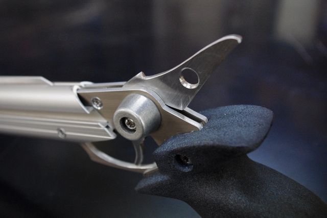 電解発色されたシャイングレーというアルミ材により、ステンレス部品(トリガー・ホールドフック・銃身)とアルミ部品(銃身補強の形材・メインフレーム)の区別がしにくく、統一された質感を放つ。