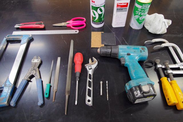 ・ミゼットニッパー ・鉄ヤスリ (種類は多いほど便利。今回使用したのは、三角の荒目・半丸の中目・三角の細目の3種)・紙ヤスリ#80~#120(最終仕上げ用。番手はお好みで)・両面テープ ・ネジロック(瞬間接着剤で代用可)・プラスドライバー ・スパナ(レンチ、その他、M4のナットを押さえられれば何でも。ラジペンでも可)・ラッカーうすめ液 ・ウエス(ぼろ布)