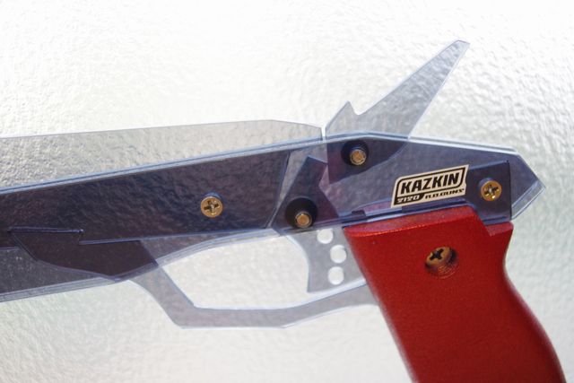 厚さ2mmのポリカーボネートで作られています。ポリカもタップを通してネジが切れる材料です。薄く柔らかいのでしなりまくりですが、ゴム銃としての運用に支障はないようです。似ていますがアクリルとは違いまして、割れることがないので加工が楽ちんです。スモーク色なので、光にかざすと内部の動きが見えて楽しげ。