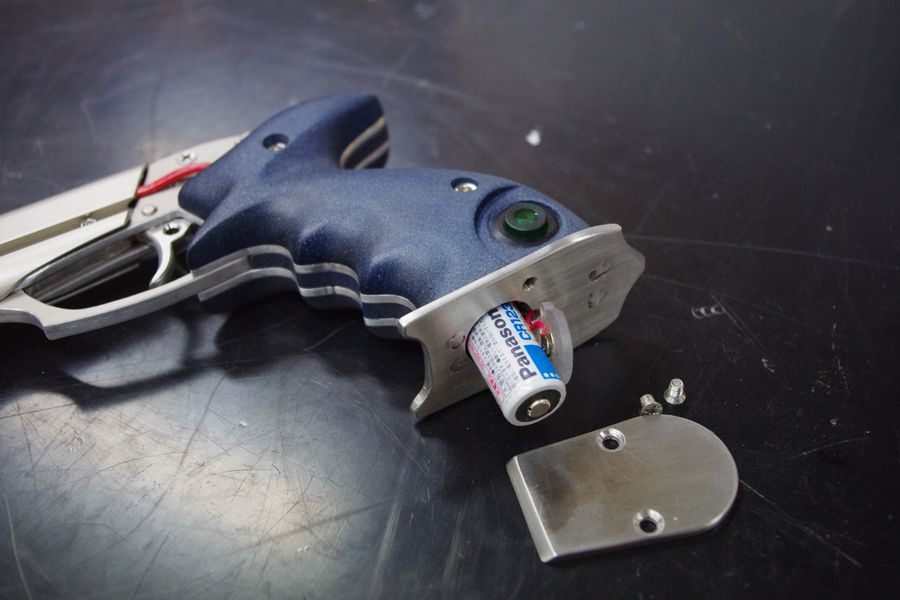 レーザー発光部は、ホールドピンから離れない位置にした方が、射程距離の変化による弾道と光軸のズレが生じにくい。そこで初代同様、ホールドピン直下にレーザー発光モジュールを設置。断面が長丸の銃身パーツの内側に丁度良く収まっている。