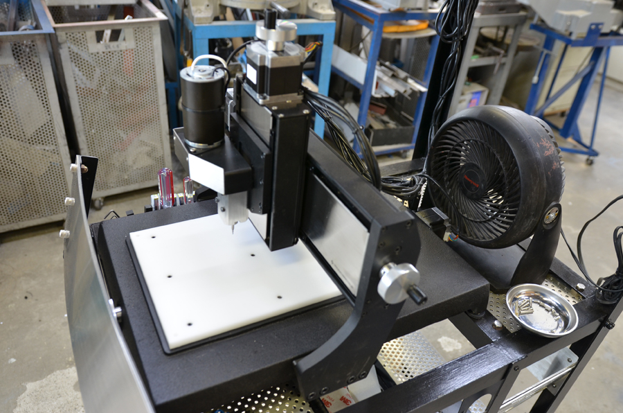 数時間に及ぶ切削加工中は大量の切り屑が発生します。放置すると切り屑がつまってエンドミルを折ってしまうことがあるそうです。かといって長時間付きっきりで除去などしてられません。そこでCNCフライスの後部にサーキュレーターを設置。加工中は回しっ放しで風をあて、切り屑を吹き飛ばす作戦(時間がきたらタイマーでOFF)。