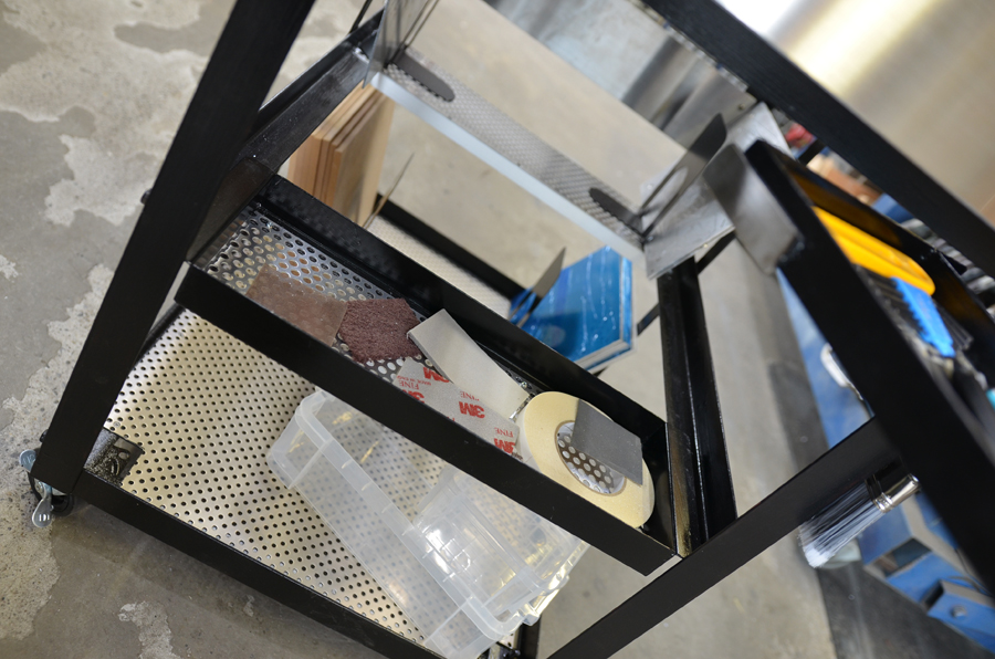ラックの下段は加工する材料を収納しておく場所に。2段になっていてRD300が加工できるサイズ(だいたいA4ぐらい)の3mm厚アルミだと200枚以上収納しておけます。手前にはスライドしたり取外しできるトレイを設置。