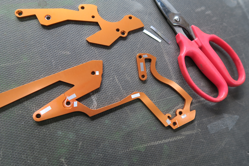 組立の際、忘れてはならいのが上の写真にあるスペーサーの貼付けです。加工図を参考にパーツの裏表にカッティングシートなどを細かく切って貼付けます。これをやらないとトリガーが動きません。またバネはホムセンで売っている径5mmぐらいの引きバネです。なければ輪ゴムでも代用可。ネジやスプリングピンはモノタロウなどのネット通販で買うと良いかも。