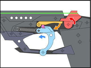 トリガーを引くと上部突起が下がりながら後退を始め、シアが下がりリアフックが回転。