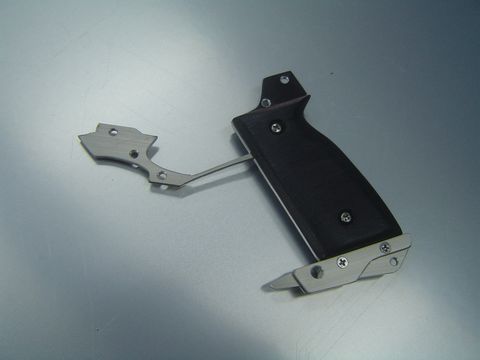 グリップは競技用のような指に合わせた削り出しにせず、シンプルなデザインとした。下部のパーツは専用展示台に連結する為の溝加工が施されている。