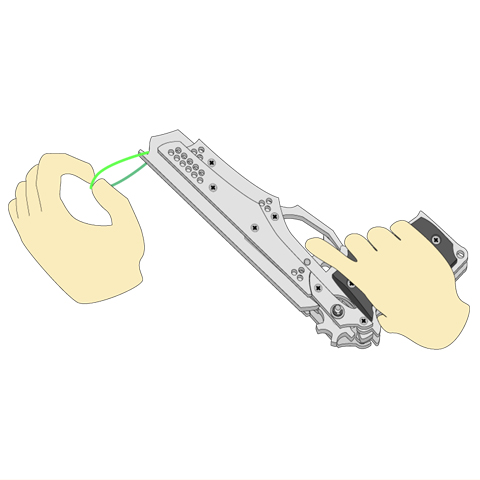 単純に前(ホールドグルーブ)と後ろ(ホールドフック)にゴムを掛ければ飛ばす事は可能です。しかし、より鋭く安定した弾道のゴムを放つにはテクニックが要ります。下で紹介する方法は慣れれば簡単ですし、精密な射撃には不可欠となる掛け方ですので、ぜひ実践してみて下さい。