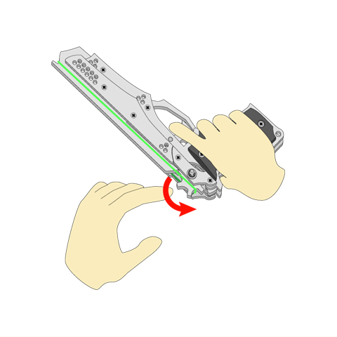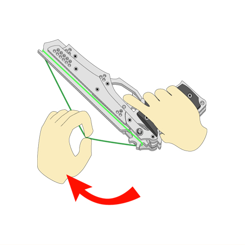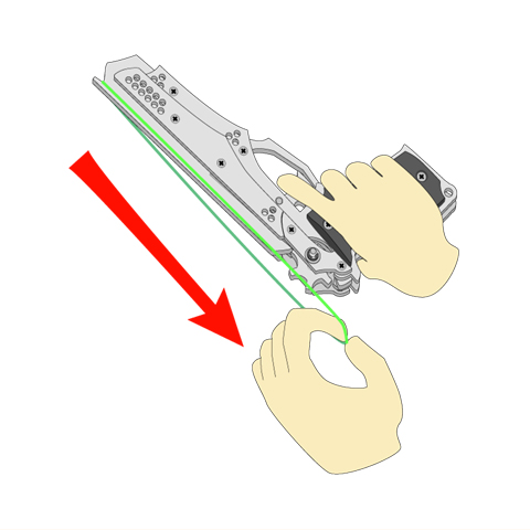 輪ゴムがホールドフックに触れているのを確認したら、その手を徐々に前方へと移動します。