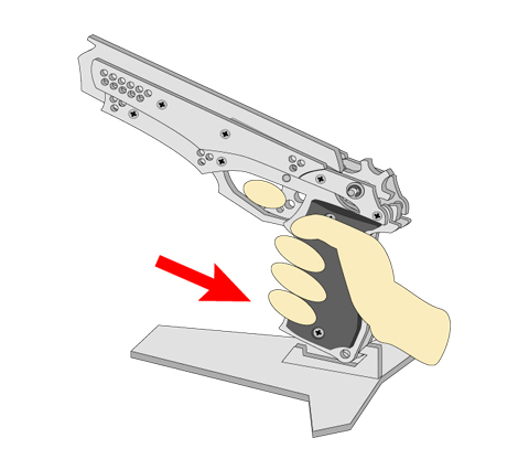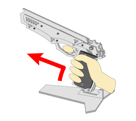 1. まず銃を撃つ手(利き手)でグリップをしっかり握ります。装填中に誤ってトリガーを引かないように注意して下さい。