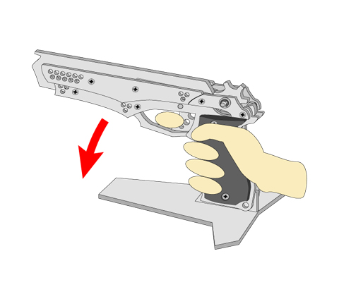 2. 銃を降ろします。台座の前側の出っ張りが銃底部に填まっていれば、銃の重みで台座から外れる事はありません。銃を前後に動かし、しっかり填まっているか確認して下さい。