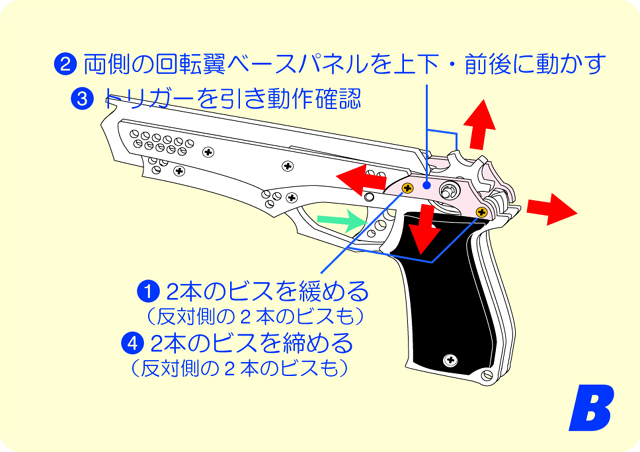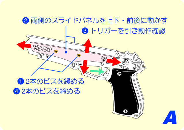 連発銃でのトリガー操作の注意点。引く時は一気に奥まで引き、戻す時も一気に戻すように心掛けて下さい。ゆっくり操作したり途中で止めると、装弾数や使用する輪ゴムによっては、まれに2~3発連続して発射される場合があります。
