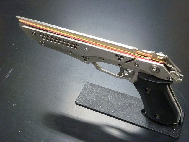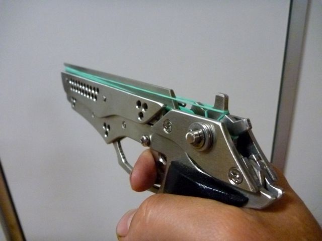 トリガーを引くとスライドが前後し輪ゴムを発射。「ガシャン」という音が金属フェチの心を癒してくれますw また重量も程よいズッシリ感に納まりました。約2倍の重量の『銀狼』だと重すぎて腕が辛いんです^^;