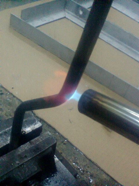 こちらはストックに使う丸パイプをバーナーで炙って曲げている様子。