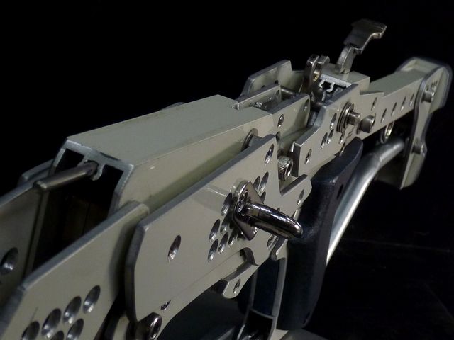開閉式バレルカバーは射撃時に高速で動作する機関部から安全を確保する役割があり、キャリングハンドルにもなる。このレバーを下げるとバレルカバーのロックが解除し開くことが出来る。閉めるときは自動でロックがガチッと掛り、即、取っ手を掴んで持ち運びが可能。