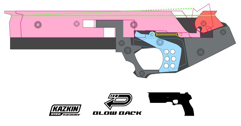 ・後退してから前進する拳銃のブローバックと同じ動作のギミックとなること。