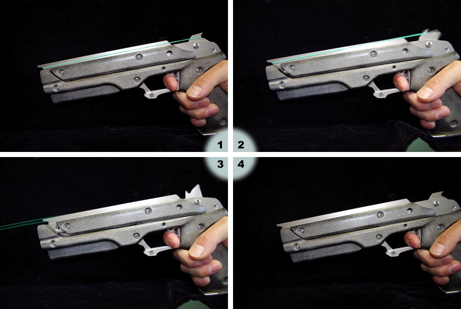銃身長を230mm確保しながらも、銃身の後退とホールドフックの回転により、リリース瞬間は実質195mmと、このサイズの単発銃としては、やや弱めの威力となる。