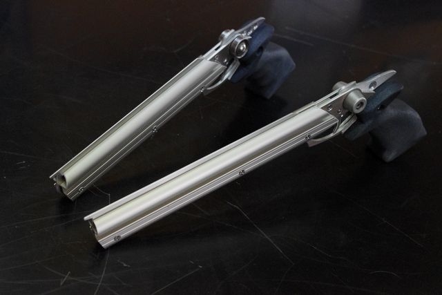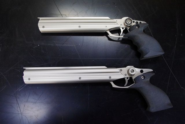 ゴム銃の公式競技には、静標的精密射撃2種と動標的射撃1種の3種目があり、1号機は前者2種のみの運用を想定して開発。一方の2号機は全種目に対応するべく設計に変更を加えたカスタム仕様となっている。