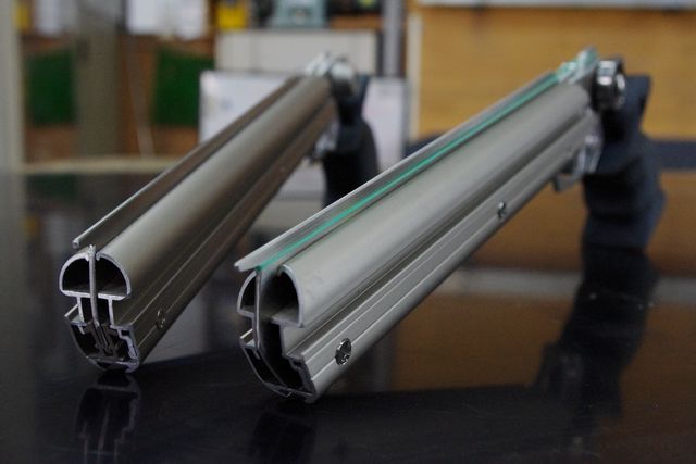 断面は長丸のような形で2分割でき、上部に薄い板が挟めるようになっている、まさにゴム銃作りにうってつけの大きさと形状のアルミ形材を使用して作られた銃身部分。