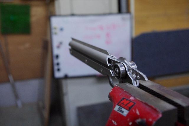 電解発色されたシャイングレーというアルミ材により、ステンレス部品(トリガー・ホールドフック・銃身)とアルミ部品(銃身補強の形材・メインフレーム)の区別がしにくく、統一された質感を放つ。