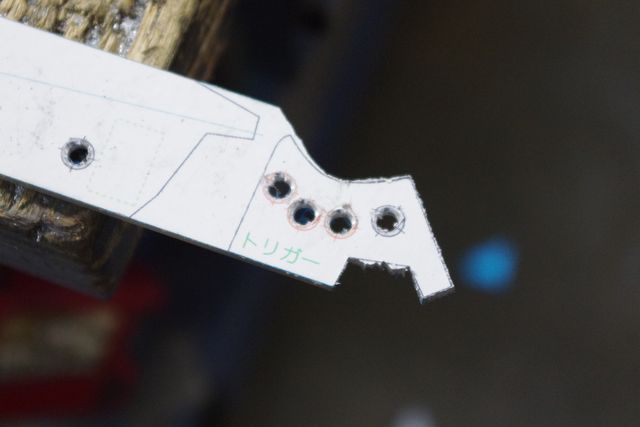 銃身は先端よりむしろ後端のカットラインを正確に切るよう心がけて下さい。トリガーの引きしろ・戻りしろ、フックの回転限界位置に係る部分ですので。