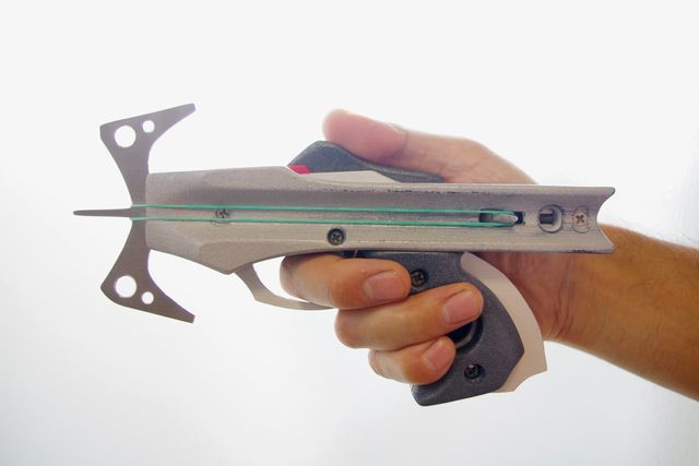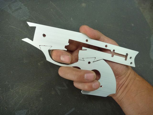 今回、銃身を金属ではなく板厚のあるMDF製にしたのは、輪ゴムを引き延ばすラインに大きく窪んだ溝加工を施す為である。装填時、この溝が指をホールドフックへ真っ直ぐに送るガイドとなり、ミスすることなく輪ゴムが掛けられるという狙い。