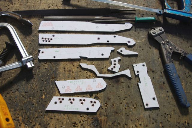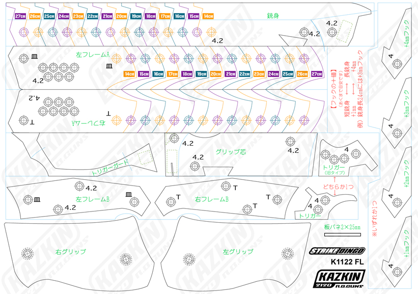 A4用紙1枚分の図面で銃身長14cm~27cmまで作れるようになっています。切断線と穴位置をお間違いなきよう注意(色分けしてあります)。