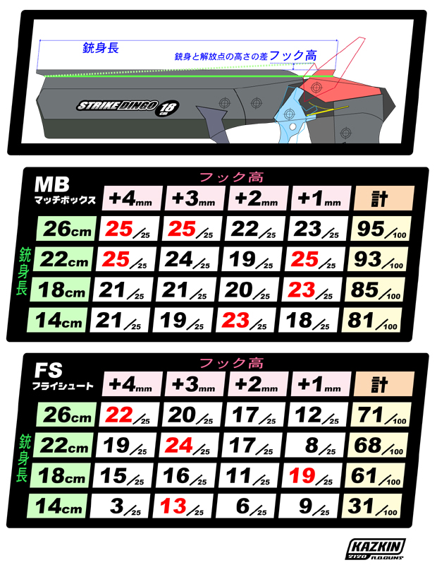 結果(右表)は一概に判断できない部分も多くあるが、銃身を長くするほど、フック高も高くした方が良さそう。…ってことより、やっぱり銃身は長い方がよく当たるようだ。それに仕上げ調整を行わないと競技で使えるレベルには至らないって事も解った。FS酷し!この結果に、むしろ短い銃身の競技用銃を作ってみたくなる天邪鬼な自分w