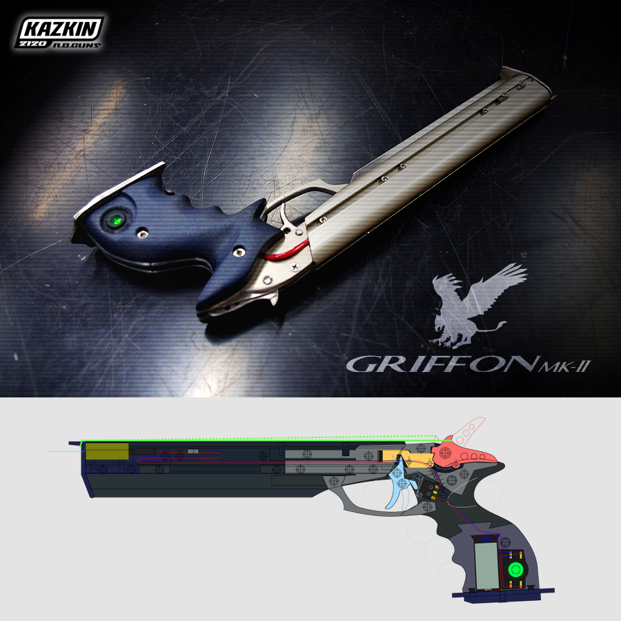 ベルクート、ジャッカルmkII、ディンゴなどトリガーとフックの直結型は、作り易く動作も安定し易いのが利点。一方の初代リカオンからウィーゼル(mkIを除く)を経てのグリフォンの構造はトリガー~フック間にスライドパーツを介してまして、ちょっと複雑になります。メリットは、1.復帰バネにより確実に戻るフック。2.フックを後方に設置できるので、全長を抑えながら銃身長を稼げる。3.レーザーONのスイッチに用いるためのトリガーの引きしろを十分に確保できる。などです。