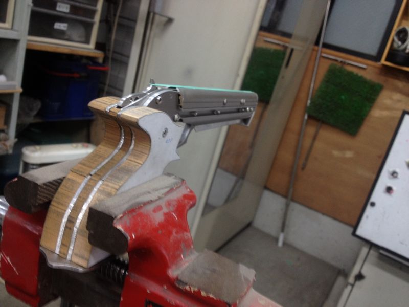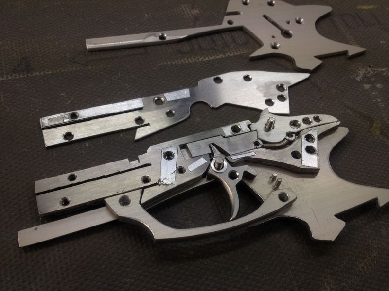 ホールドフック、スライドパーツとその周囲のセンターに位置する部品はすべて3mm厚のステンレス製。その両側に1.5mm厚のステンレス製インナーフレーム、さらにその両側に3mm厚のアルミ製メインフレームという5層構造。トリガーは5mm厚のステンレス製。トリガーガードは6mmのアルミ製。