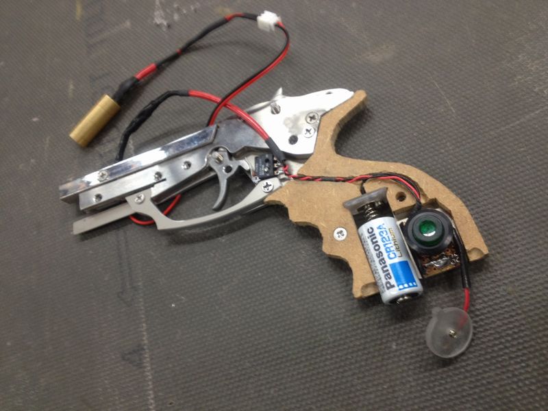 レーザーサイトを使用せず、装填した輪ゴムのラインを読み取り照準を合わせる通常の射撃も行えるよう、トリガー連動スイッチに加えメインスイッチも設けた。競技時に「レーザーなんか無くたって」ということを証明したい場合はOFFにすればよい。ただし逆効果もあり得るw