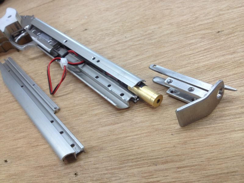 そして発射機構とは別にレーザーサイトの為の電子部品の配置と配線の取り回しがさらに内部を複雑にしてくれている。特にグリップ内部は2つのスイッチと電池がひしめき合い、市販の電池ケースを使用する余裕がなく端子などを自作する羽目に。