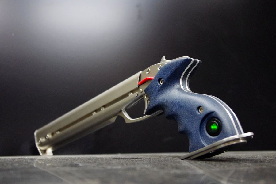 『GIGAZINE』輪ゴムを狙ったところに確実に当てるレーザー照準搭載のゴム銃「グリフォンmk-Ⅱ」
