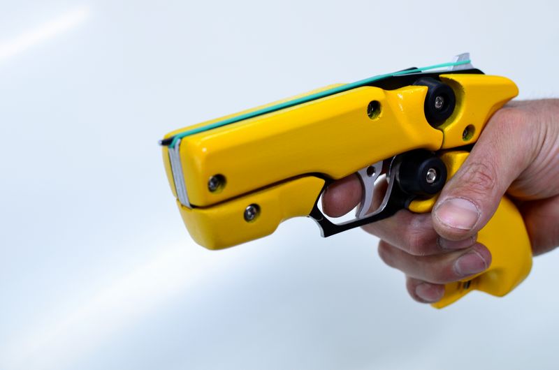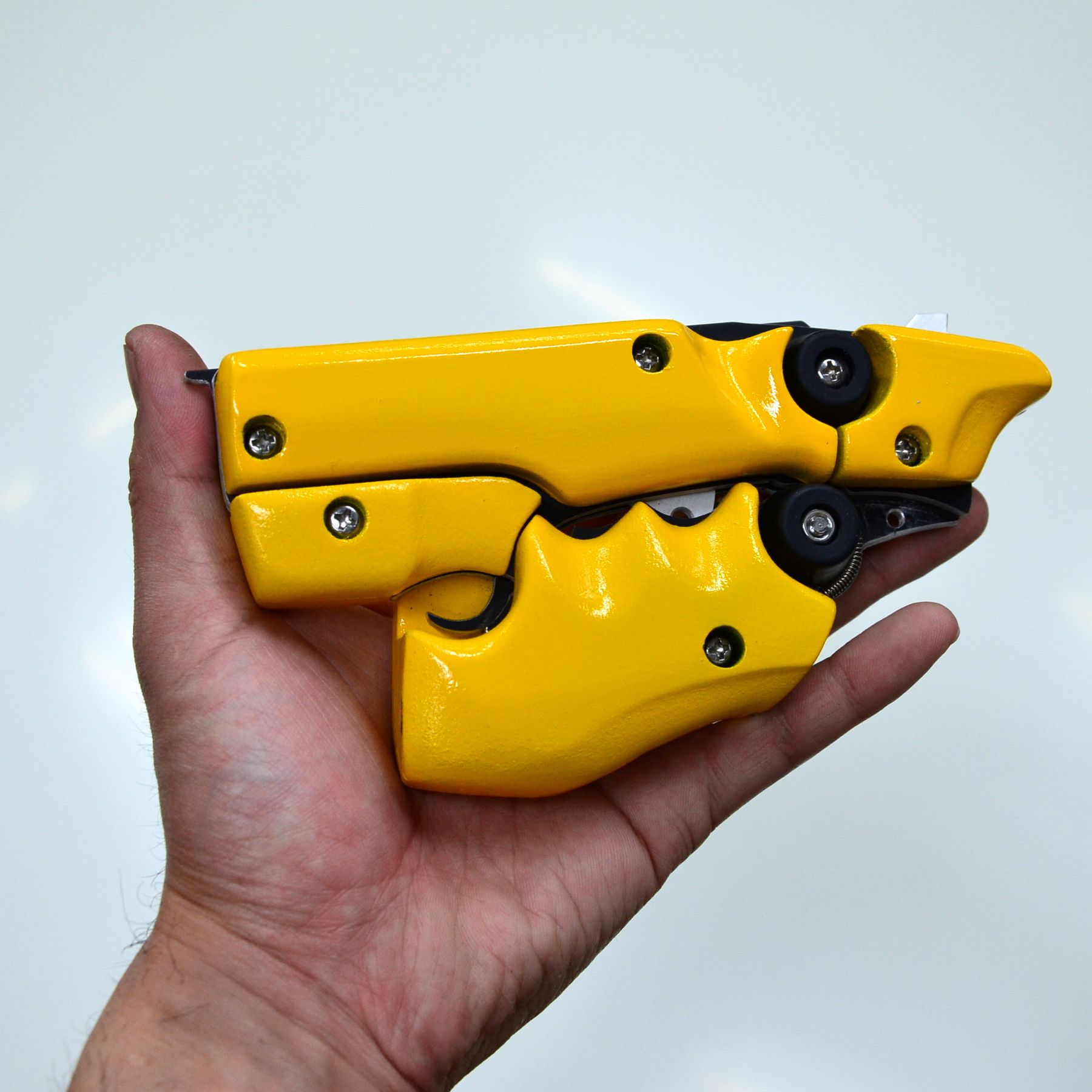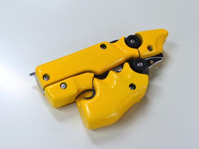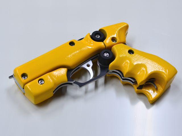 弊社従来の作品にみられる3mm厚のアルミを重ねただけのモデルは、角度によっては薄っぺらく見えてしまう。それを解消する全体をMDF板で覆うようなデザイン設計は『パンサー』に次ぐ2作目。中央9mm、両側12mmのMDF板を重ねた銃全幅は33mm。短い全長と相まって、実在する拳銃に近いボリューム感溢れるシルエット、、ではあるがそんな拳銃らしさをかき消す黄色いボディが、何かの工具を連想させる。