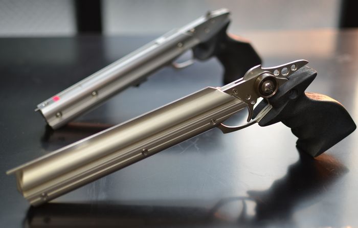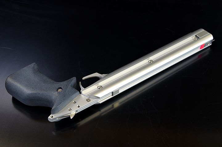 銃身長24cmの標準バレル。銃身内部から照射されるレーザーポイントを直接、標的に合わせるだけの直感的なエイミングが行える為、誰にでも扱いやすいタイプ。日本ゴム銃射撃協会の公式競技でも使用は制限されておらずレーザーサイト愛用者も多い。ただ会場に居合わせたチビッ子から「あれ、ズルい!」などの非難を浴びることは予め覚悟しておく必要があるw
