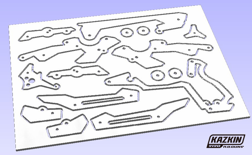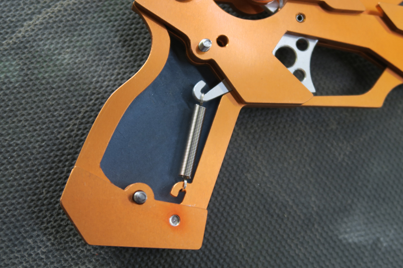 組立の際、忘れてはならいのが上の写真にあるスペーサーの貼付けです。加工図を参考にパーツの裏表にカッティングシートなどを細かく切って貼付けます。これをやらないとトリガーが動きません。またバネはホムセンで売っている径5mmぐらいの引きバネです。なければ輪ゴムでも代用可。ネジやスプリングピンはモノタロウなどのネット通販で買うと良いかも。