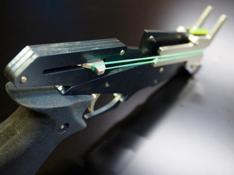 この競技と相性が良い「サイドフック式(横掛け式)」と呼ばれるゴム銃がある。