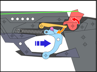 シアの変則的なカットラインにより、トリガーが一定量後退すると、ゴムの力はトリガーを引き込む方向に切り替わります。