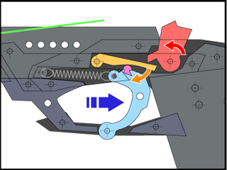 トリガーを引くと上部突起が下がりながら後退を始め、シアが下がりリアフックが回転。