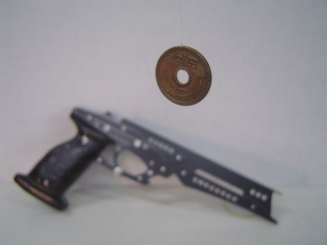 で、初めに作ったのが銃身長17cmモデル。ところがショートバレル銃に輪ゴムを平掛けして撃った場合、見当違いの方向に飛んでいく弾が少なくないことを知ります。そこで3cm伸ばしたバレルを作り換装、そして再び試射。集弾率は若干良くなったもののまだ不満。また威力が無い分、コインの揺れ幅が小さいのも自分にはむしろやり難いことに気づきます。